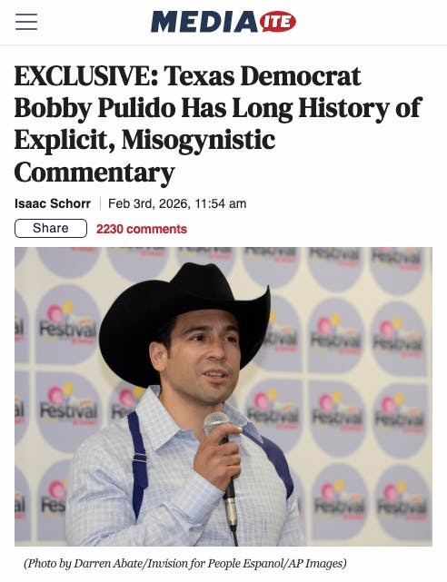 ALAMO, TX - In an exposé published today on Mediaite, reporter Isaac Schorr highlights a troubling history of explicit and misogynistic commentary Bobby Pulido has posted on social media over the years. The article notes that Bobby deleted a previously unreported tweet that included a gross reference to female genitalia on a picture of a former U.S. Senator and high-ranking cabinet official after the reporter reached out for comment. The article further highlights that Pulido was 43 at the time, and goes on to highlight incidents as recently as 2023 in which Pulido faced “widespread criticism.”